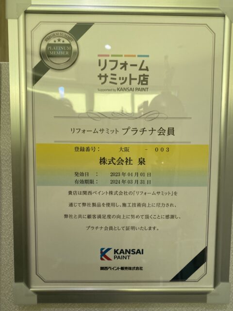 リフォームサミットの「プラチナ会員」は、関西ペイントが主催する研修会に積極的に参加し、高い施工技術と顧客満足度向上に努める塗装店に与えられる最上位の称号です。全国で約47万社あるとされる塗装会社のうち、リフォームサミットに加盟しているのは約550社で、その中でプラチナ塗装店として認定されているのは2025年現在で、全国で170社のみです。大阪府堺市のみでは現在数社程度になっています。